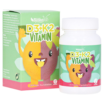 Веганские жевательные таблетки от BjökoVit содержат витамин D3 из экстрактов лишайника и витамин K2 из ферментированных соевых бобов и поэтому могут способствовать адекватному снабжению обоих витаминов.
